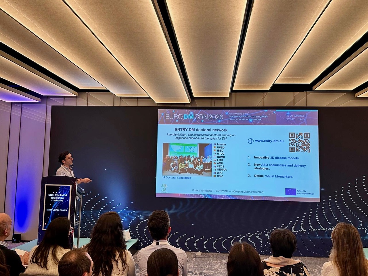 Coordinator Mario Gomes-Pereira participated in the recent meeting of the European DM Clinical Research Network annual meeting. This meeting provided an excellent opportunity to discuss pre-clinical data from mouse models and how these findings are shaping our understanding of CNS involvement in myotonic dystrophy. Importantly, these discussions are helping to define robust biomarkers that will be critical for pre-clinical development, disease monitoring in patients and patient stratification in ongoing and future clinical trials. During the event, he present edthe work of the ENTRY-DM MSCA Doctoral Network